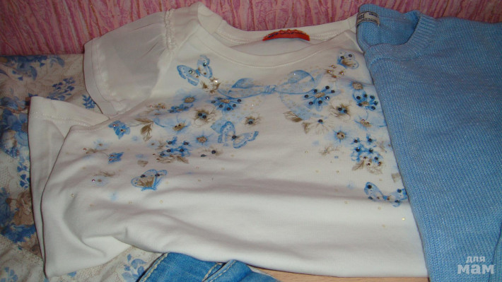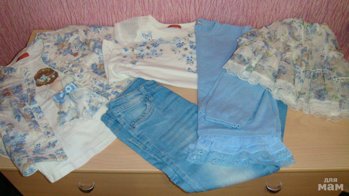 Джинсовая курточка, 2 футболки, джинсы, джемпер, юбочка, сарафанчик - 2000 рублей.