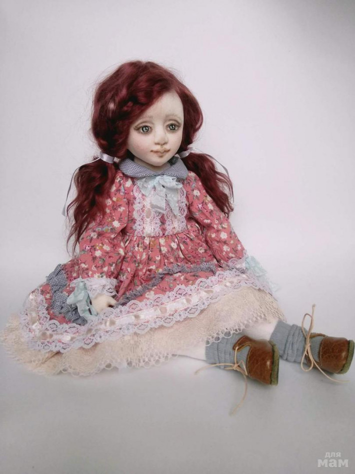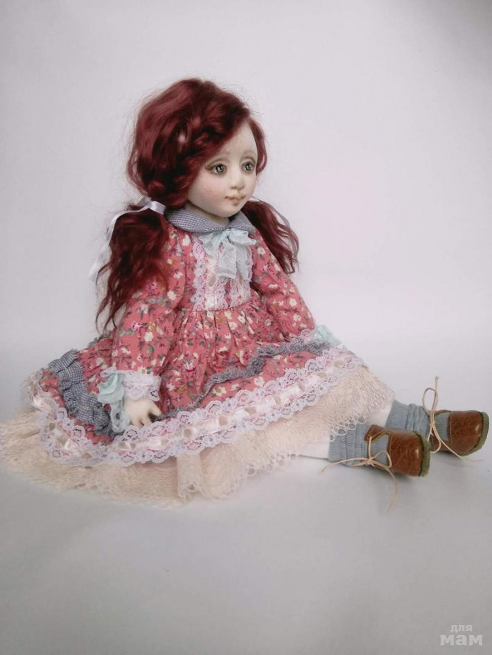 Полностью ручная работа .Куколка выполнена из хлопкового трикотажа и хлопка, обувь шилась в ручную из натуральной кожи ,утяжелена стеклянным гранулятом , умеет только устойчиво сидеть без опоры . Личико выполнено из пластика запекаемого,обтянуто трикотажем ,расписано акриловыми красками и сухой пастелью. Наполнитель холофайбер. Одежда снимается частично. Рост 39-40 см