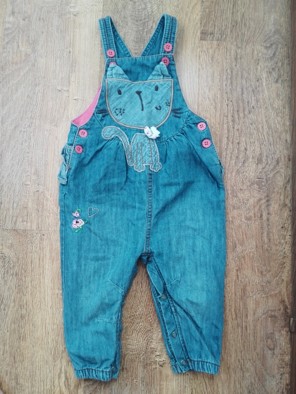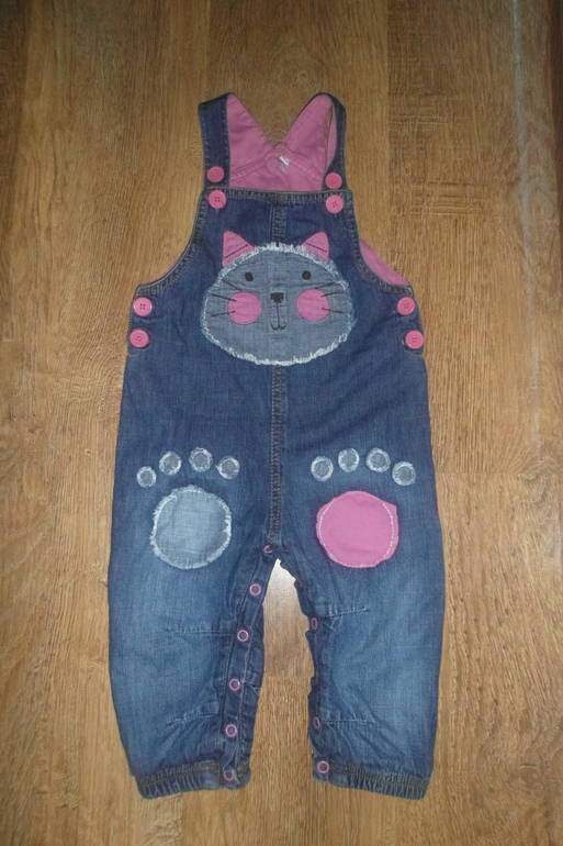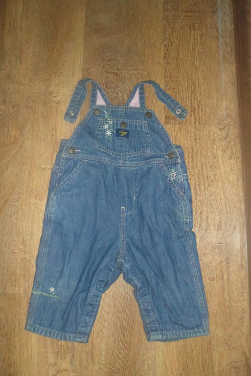10. Джинсовый комбинезон, украшен вышивкой, джинса в идеале. полностью на х\б подкладке, после стирки немного скаталась, при носке не видно, раз. 12 мес. - носили с 6 мес., мне кажется что маломерит, фирма OshKosh, США, цена 350 руб