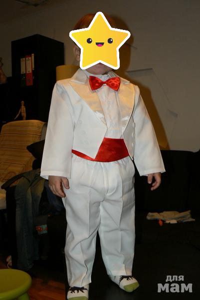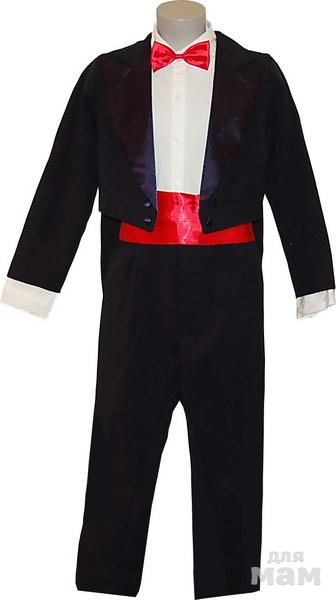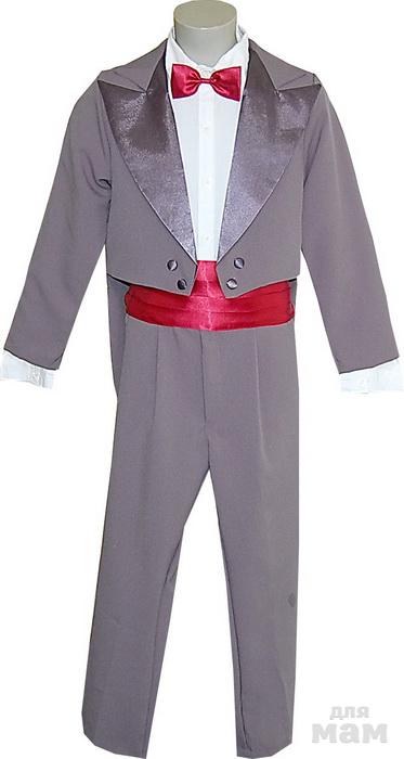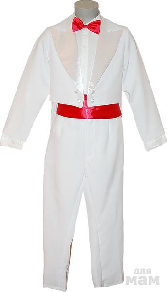 Комплект состоит из 5 предметов - фрак, брюки, рубашка, бабочка и пояс. Цвета белый, шампань, серый, черный.