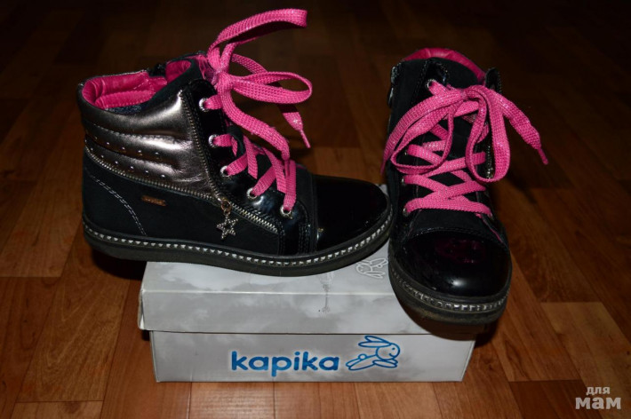 Продам обувь фирмы капика: - ботиночки 33 размер,на шнуровке очень удобно одевать сбоку молния; - ботинки 32 размер на липах- просто супер обувь! Купили на весну уже третью пару точно таких- внутри кожа, сверху лак; -туфли с бантом из страз на каблучке, одевали на 1 сентября и немного носили в сентябре. вся обувь после моей дочки, покупалась новой в ТЦ Сити парк, носили только осенью, в этом году нам уже малы. По почте высылаю.