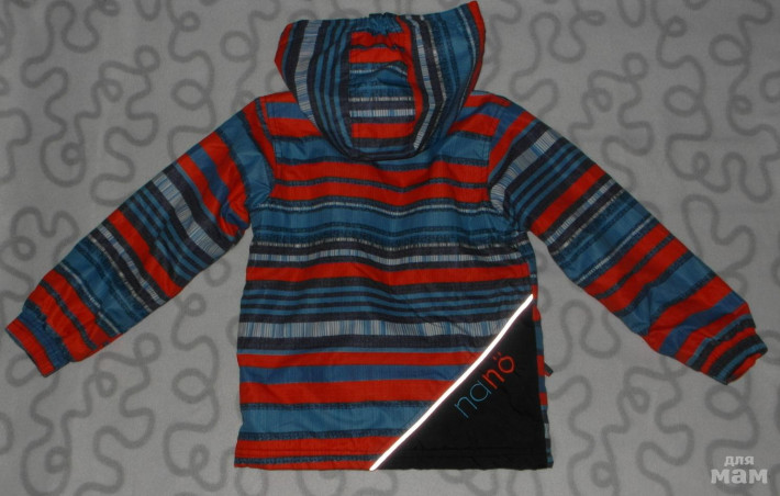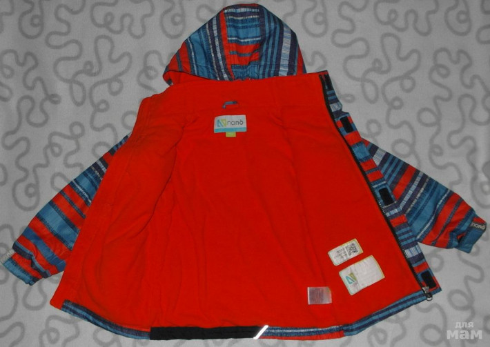 Куртка имеет светоотражающие элементы, прорезные боковые карманами на молнии и на груди. Застегивается на молнию, собачка которой убирается в защитный кармашек, чтобы не натирать ребенку подбородок. Есть еще липучки.