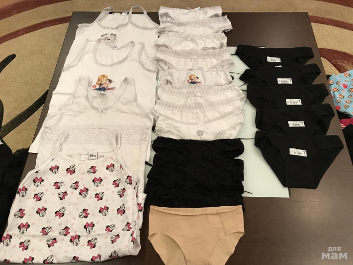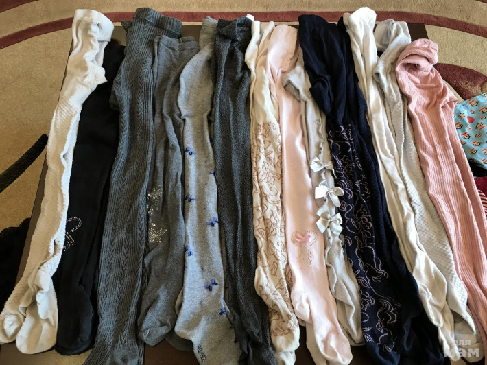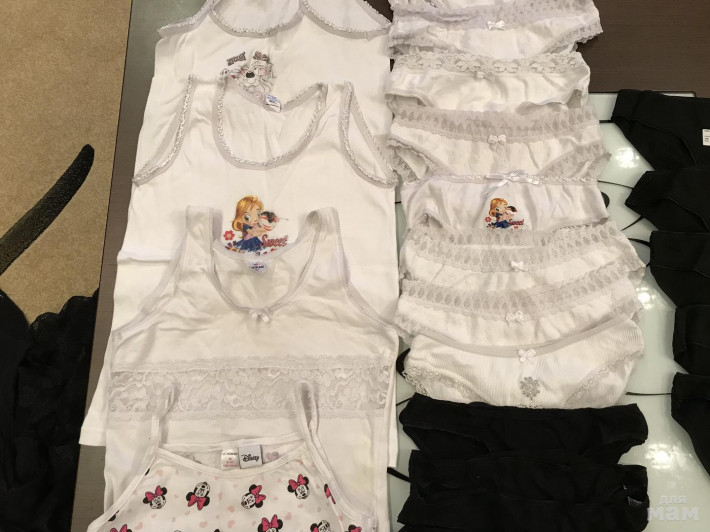 Колготки 14 штук. Состояние хорошее. Но на 2-3 штуках надо зашить мысочки или шовчик. Майки 4 штуки. Трусы новые 5 шт и (14 б/у в подарок требуют вывести пятна на белых). Носки 6 штук. Вещи примерно от 5 до 7 лет. Цена за пакет.