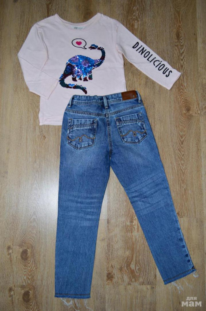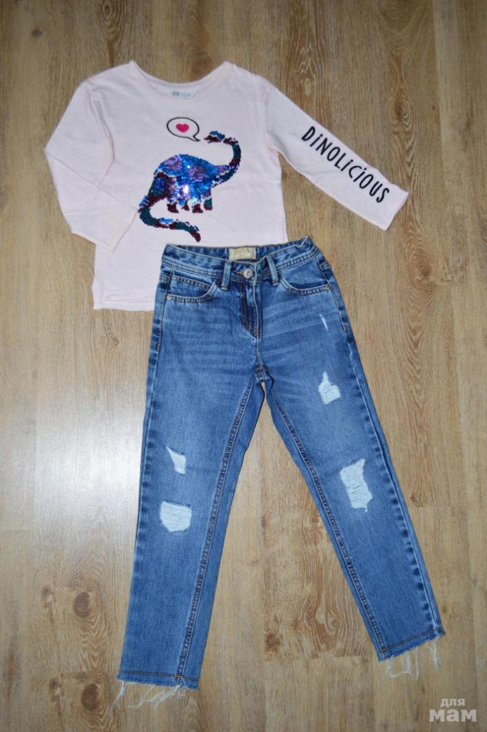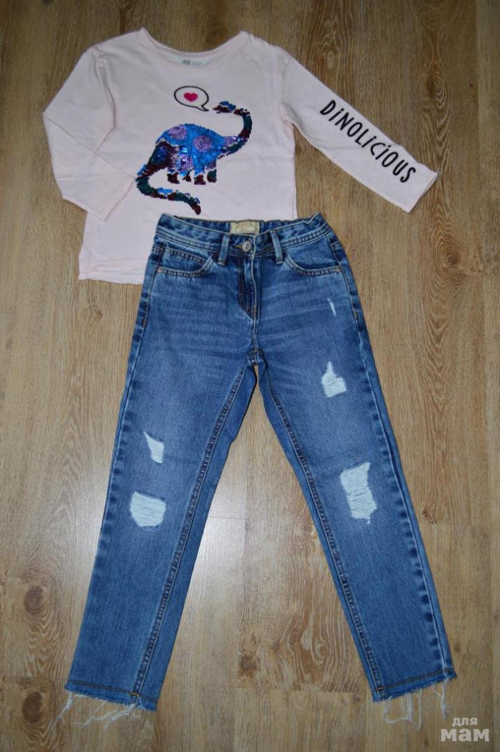 Комплект: новые джинсы некст, супер моднявые и топ из хлопкового трикотажа с рисунком из двухсторонних пайеток спереди. Длинные рукава с пришитыми отворотами снизу. Разрез и необработанный край снизу, спинка немного удлинена. Смотрится красиво-дорого-стильно, мечта любой девчонки! Покупала за 749р. Новый с бирками и в фирменном пакете. Отдельно джинсы (проданы) лонг 650р.