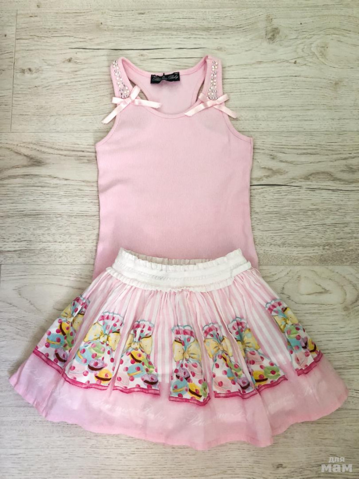 В идеале,размер маечки 36мес , юбочки 2 года. Маечка отлично тянется, но прекрасно держит форму,не деформируется ни при носки ни при стирке, юбочка воздушная 100% хлопок, внутки подъюпник для объёма. Если ребенок стройный можно смело до 4х лет.
