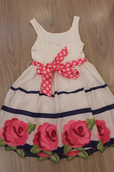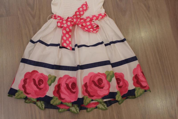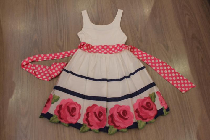 Моннализа р. 8, очень нарядное, одевали пару раз, в идеале, пышная юбочка с подъюбником, сзади на резинке (подойдет детишкам упитанным и обычным), пояс шелк в горошек, сзади завязывается на бант, 3000 р. всего. Стоило гораздо дороже.