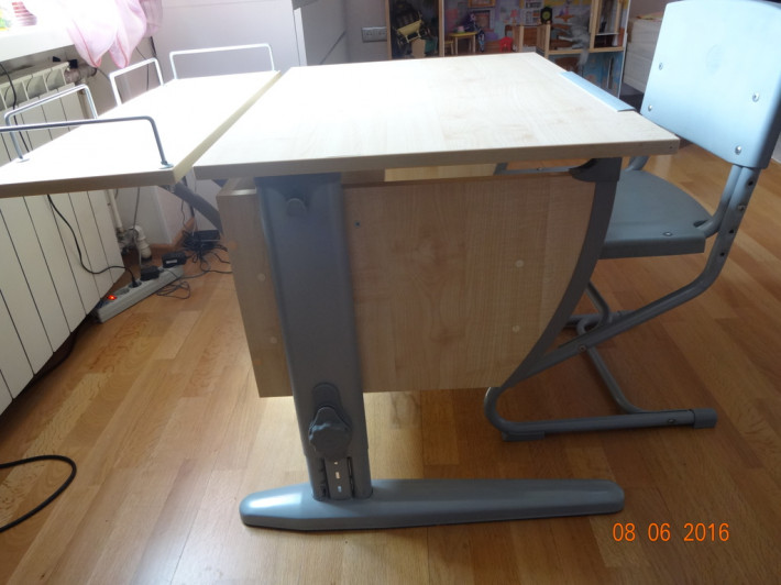 Размер стола - 75x55 см, высота стола - 53-81,5 см (рост 120-198 см), угол наклона - 26° (9 ступеней регулировки), накладная линейка, под столешницей полка для книг.