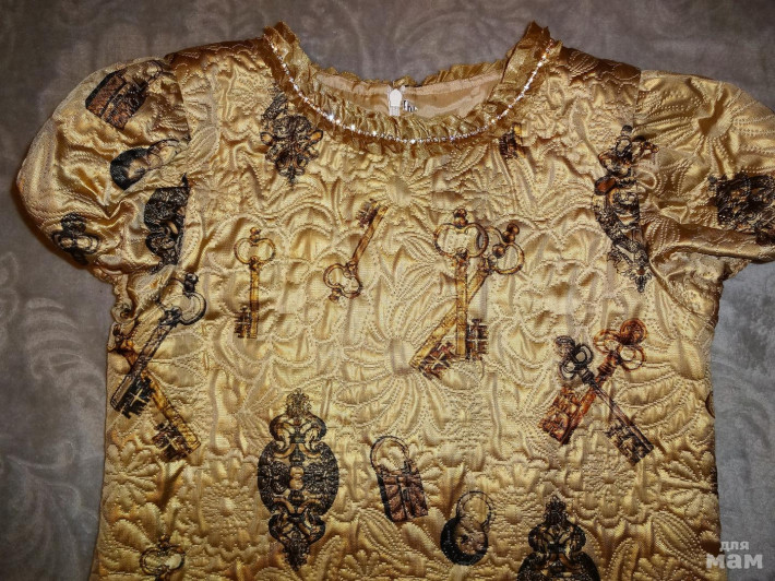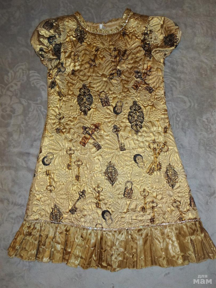 Платье в идеальном состоянии,дефектов нет.Парча тонкая,на подкладке. Ваша девочка в этом платье везде будет королевой!