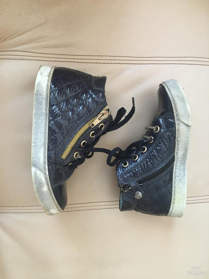 Состояние на 4, есть потертости на резиновой подошве, одна на лаке в районе пятки (см. последнее фото) и несколько мелких на лаке около 1 мм, фото их не берет. Цвет - темно-синий. Размер - 29, стелька - 18,5-19 см.