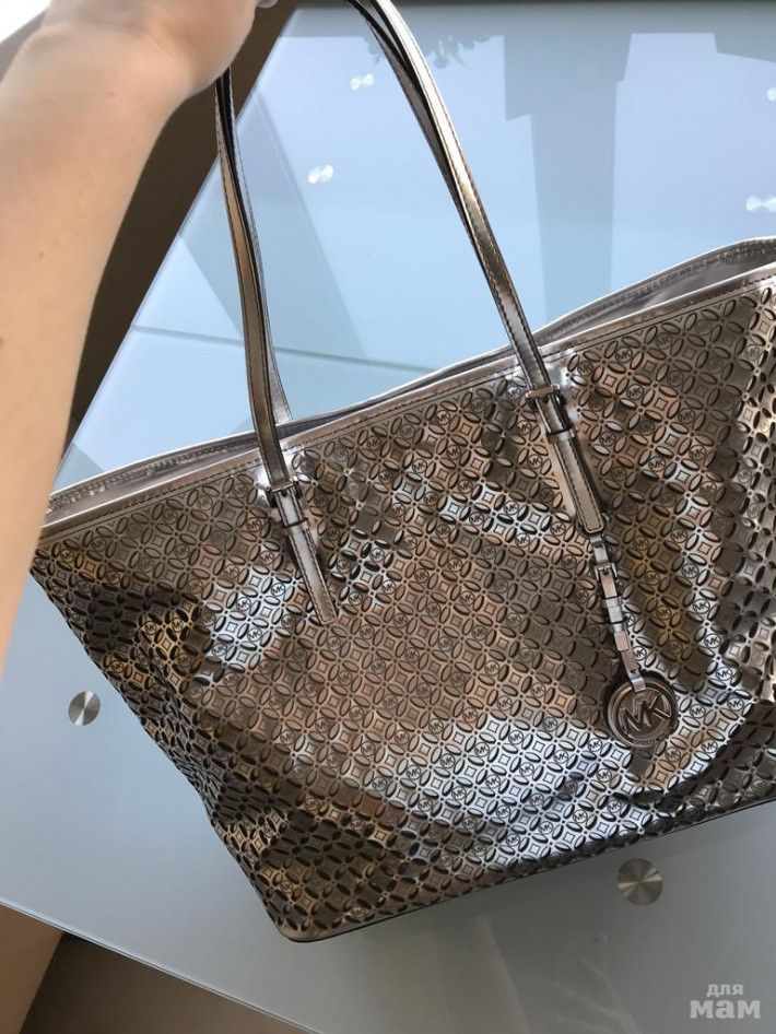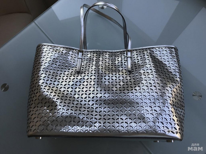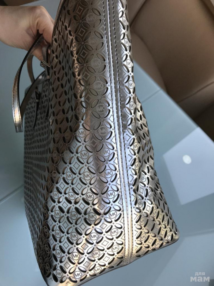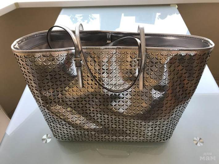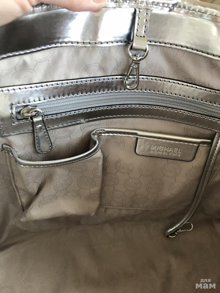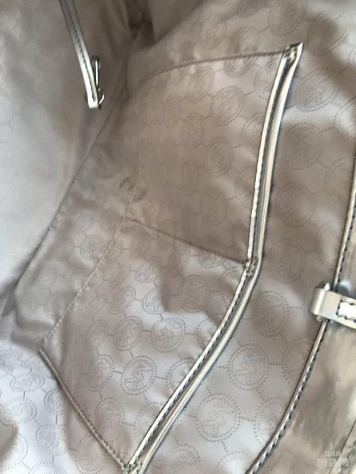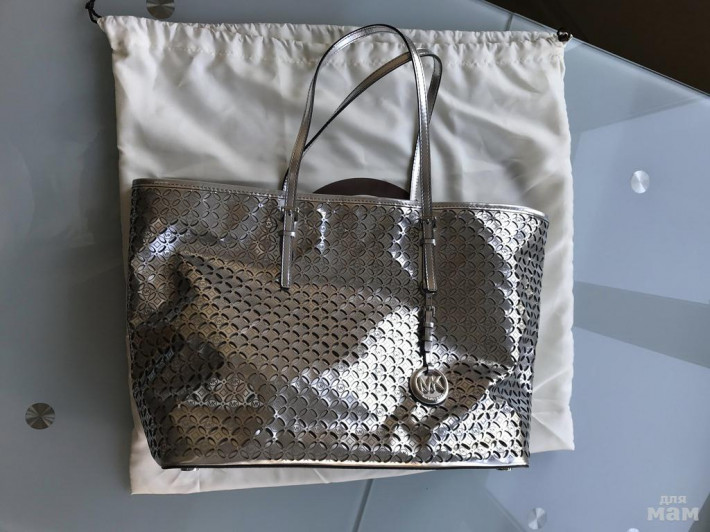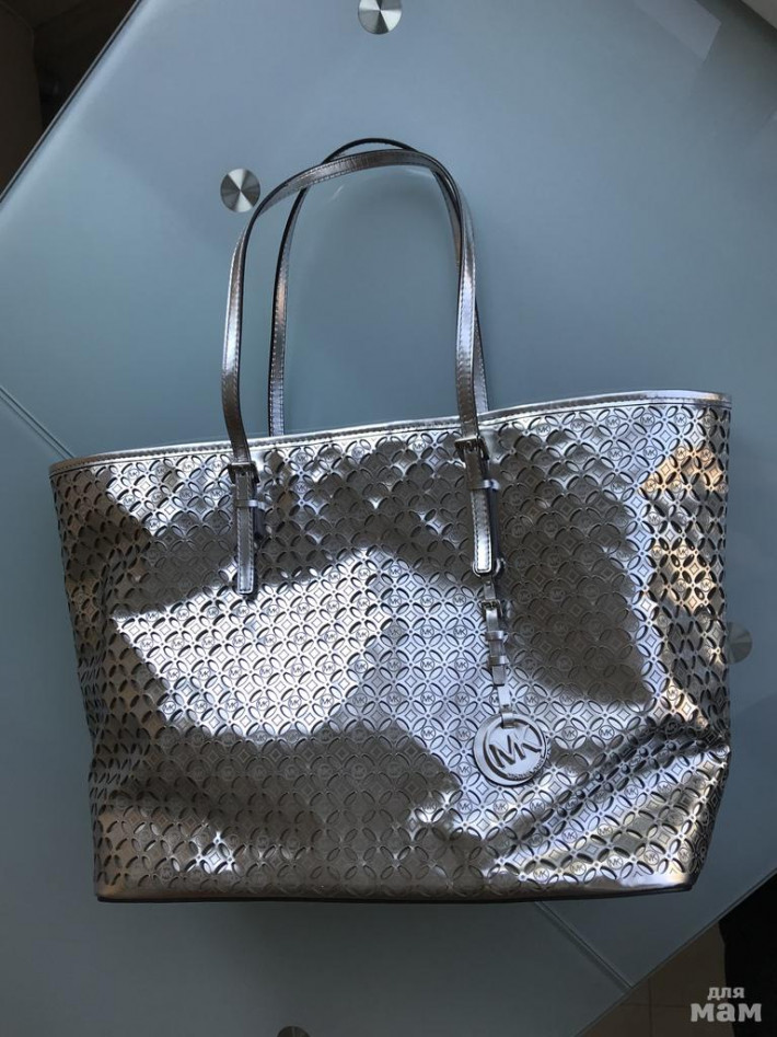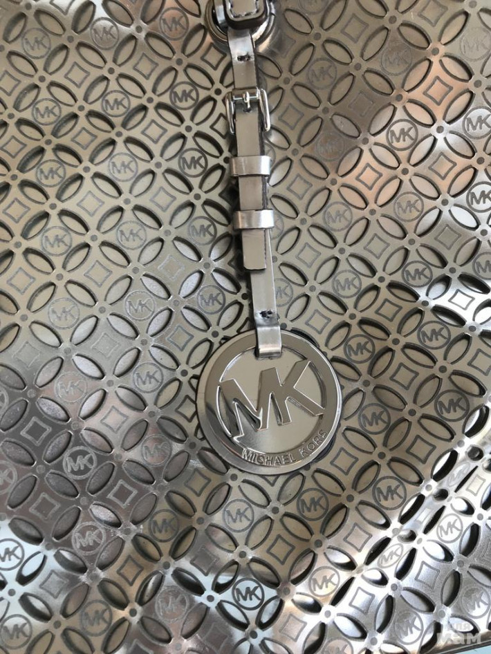 Очень Красивая Сумочка из натуральной кожи Серебряного цвета с принтом в виде фирменной монограммы Michael Kors.