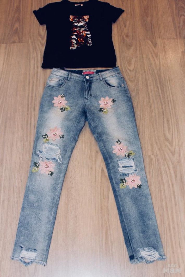 Очень классные джинсы Bear Richi на 140-146 примерно, рваные, все в вышивках и украшениях (шаговый 67), одевали пару раз, 2000 р. К джинсам футболка Орби черная с блестящим котом, стрейч, сидит по фигуре (пару раз одевали). Также леопардовый бадлон и кофточка с Бемби (не носили)