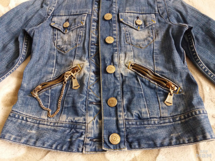 Джинсовка действительно оооочень крутая... воротник стоечка... цепи... карманы... все дела...! Маркировка 134, но маломерит. Можно смело носить и гораздо раньше, завернув рукава. Подойдет на средняшек и худышек, на пухляшке не застегнется, т.к. слегка приталенная.