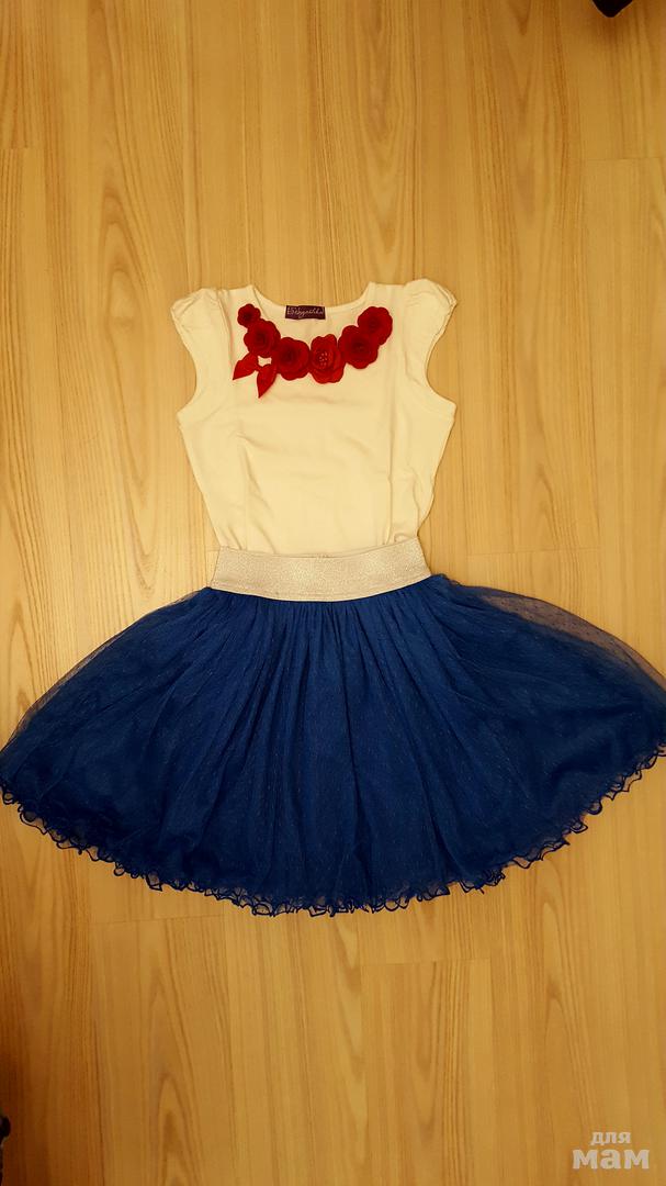 Все в отличном состоянии, многослойная юбочка, объемные цветы на футболочке, р.130 Футболка: длина 41см, ог 33см Юбка: длина с поясом 41см, пояс 5см, талия 25см (тянется)