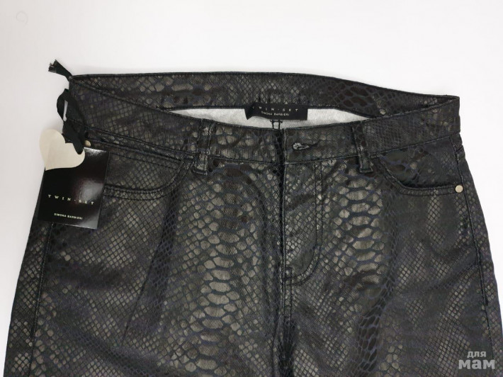 Новые. Оригинал. Эффект глянцевого покрытия, кожаные аппликации, прямой крой, посадка на талии. Размер 27. Цена 5500 рублей.