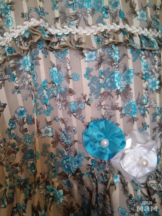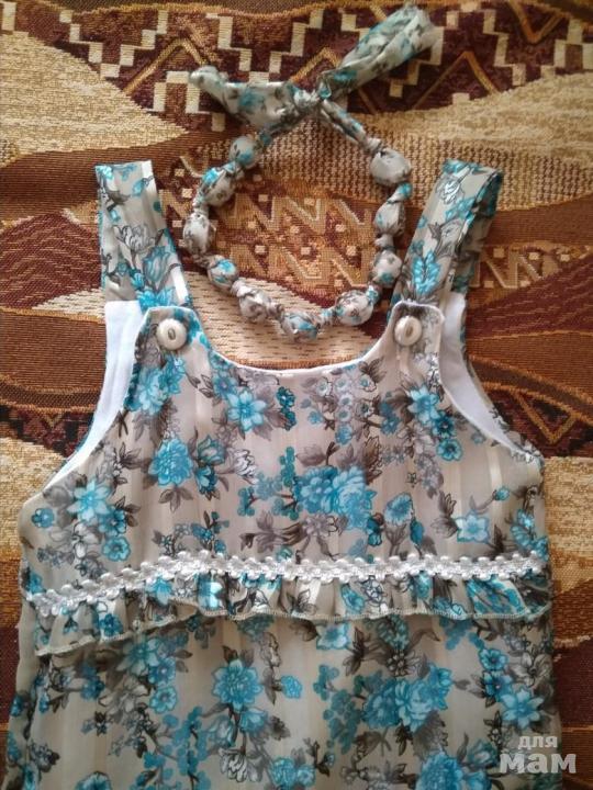 В комплекте с бусиками! Очень симпатичный! На рост примерно 116-122. Длина 64 см, ширина между подмышками 29 см. На худенькую. Сзади на молнии. Снаружи тоненький материал типа шифона, внутри хлопковая подкладка.