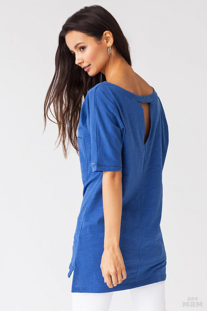 Футболка свободного удлиненного силуэта выполнена из фактурного хлопкового полотна. Модель с удлиненной спинкой и цельнокроеным рукавом с манжетой. Спинка дополнена треугольным вырезом и планкой с металлическими заклепками. Спереди накладной карман с металлической стразой-звездой.