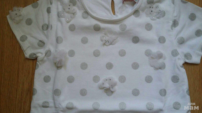 Новое нарядное летнее платье испанской фирмы Bobolli (серия Chic) на девочку 5-6 лет, трикотажное полотно, белое с серебристыми кружочками, перед украшен аппликацией в виде цветочков из ленты и страз. Состав - 96% хлопок, 4% эластан.