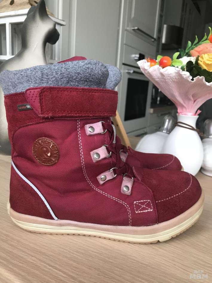 Зимние ботинки для девочки. Размер 33 по стельке 21,7 это максимум, начинать носить можно раньше ( на стельке есть отметка веселый смайлик от 20 см. Одевать удобно, с боку молния и впереди эластичная шнуровка. Сверху замша, внутри войлок , стелька вынимается тоже тёплая. Состояние отличное.