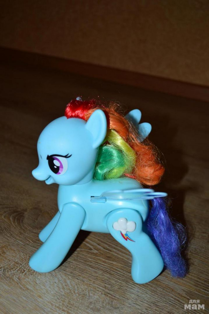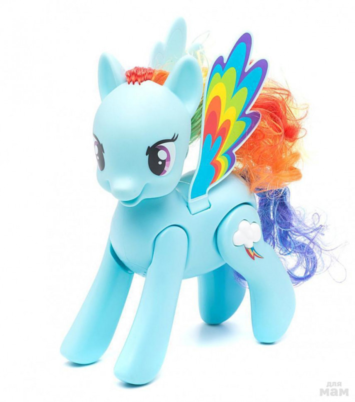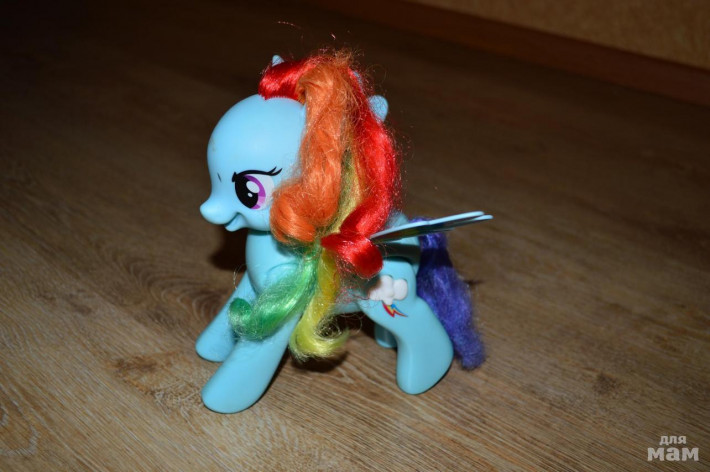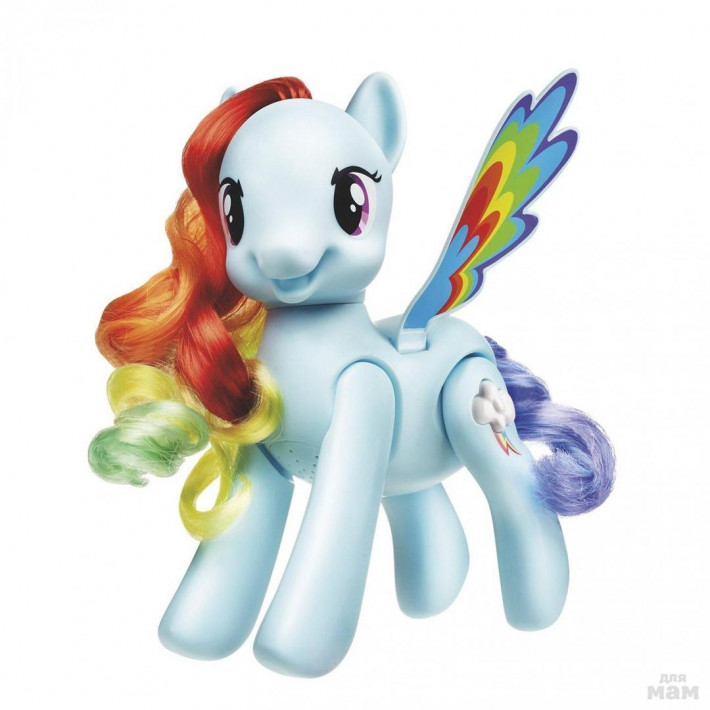 Rainbow Dash - это маленькая пони с объемной разноцветной гривой, которую можно расчесывать расческой, которая входит в набор. Проворная маленькая Рейнбоу Даш может разговаривать с ребенком, а также выполнять просто удивительные трюки - подпрыгивать и делать сальто (если ее посадить). Состояние отличное- все работает! В комплекте: фигурка пони Rainbow Dash 17 см, расческа.
