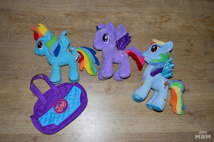 Продам мягкие игрушки пони, состояние идеальное, первая покупалась в комплекте с сумочкой, последняя музыкальная. Все приобретались в Бегемотике. Отдам все три за 850р.