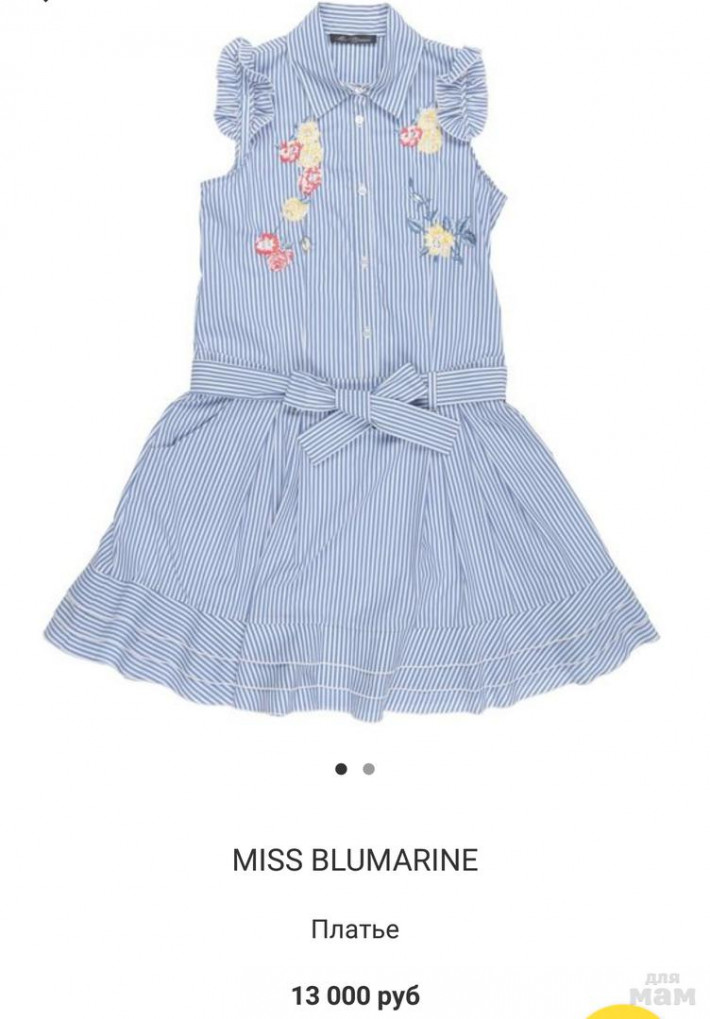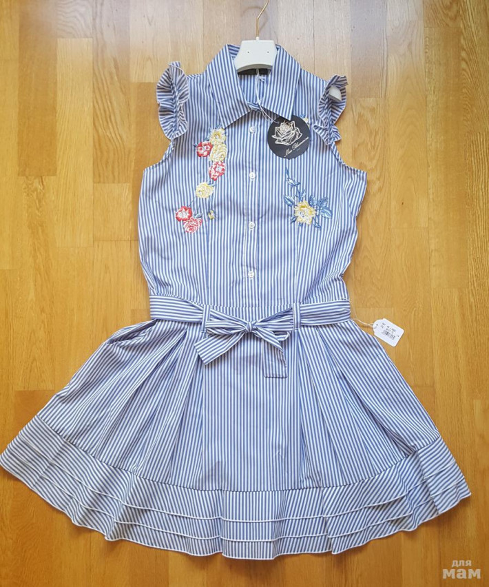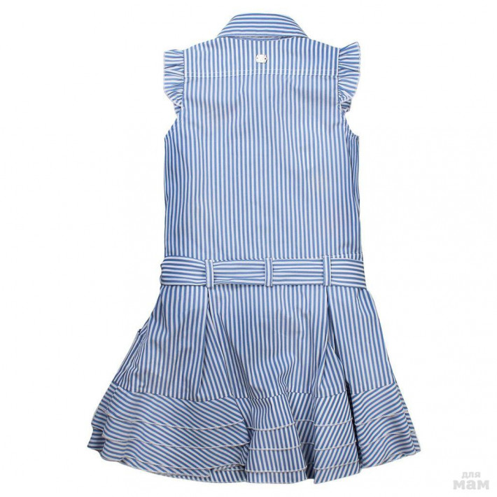 Платье Miss Blumarine Jeans в полоску из хлопкового материала рубашечного типа без рукавов. Застежка спереди на пуговицы и на молнию сбоку, отложной воротник, заниженная талия, расклешенный низ, два прорезных кармана. Цветочная вышивка спереди.