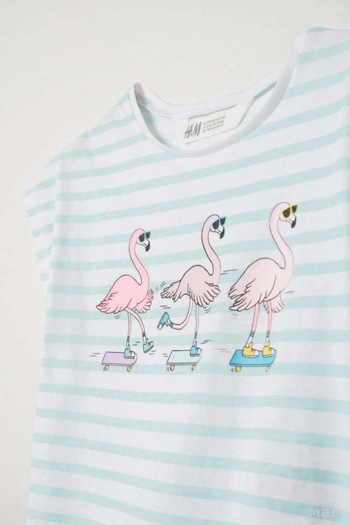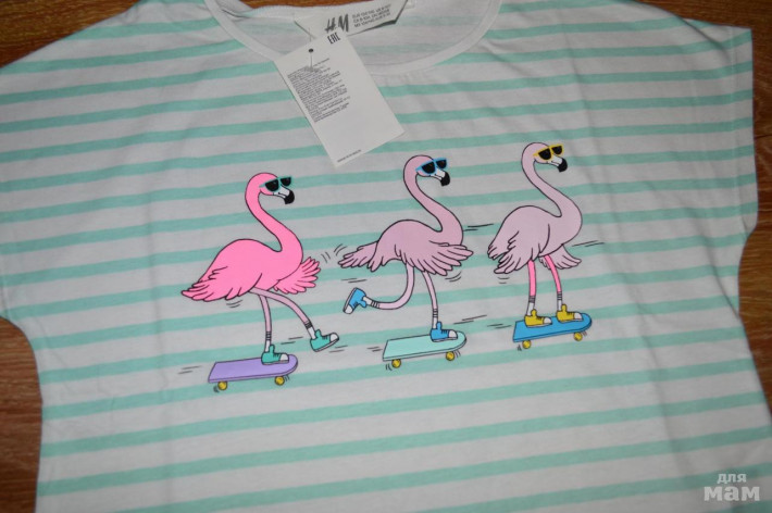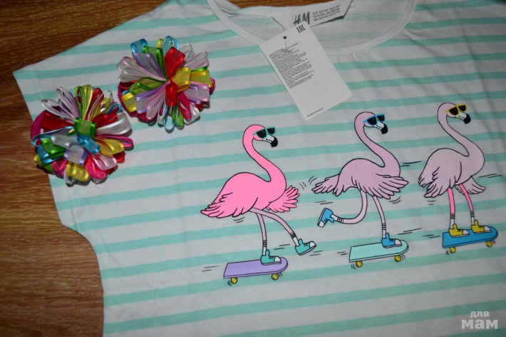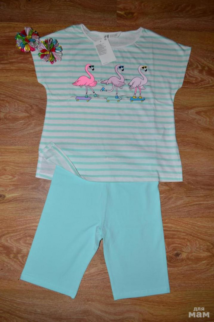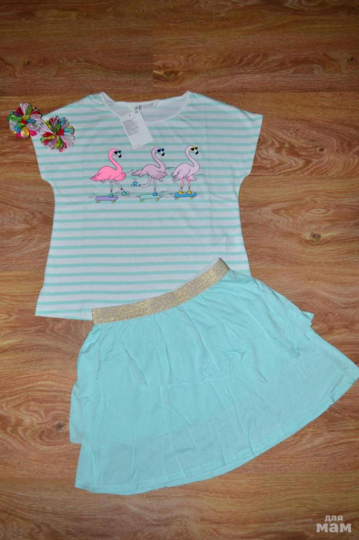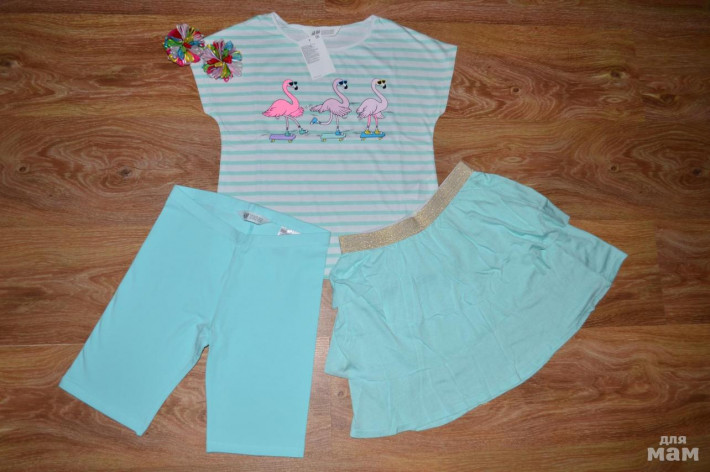 Комплект новый НМ: футболочка с фламинго, укороченные легги, юбочка с тремя воланами и пара резиночек в подарок. Очень красивый цвет (нежно мятный). Маркировка указана 134-140,но за счет модели можно носить и раньше.