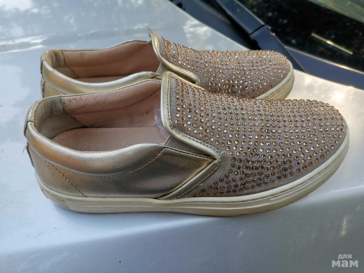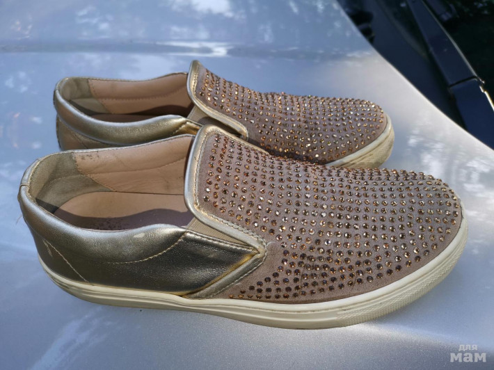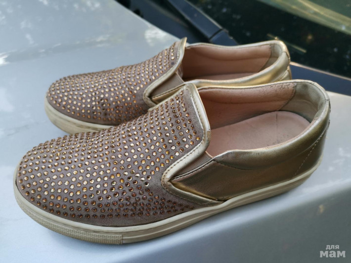 Отличные слипоны за 1500р, мягкие, удобные, ноги не трут. Стразы все на месте!, но есть потёртости на золоте.
