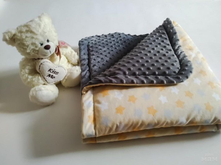 Одна сторона 100 % хлопок, другая мягкий плюш. Внутри утеплитель 300 грамм на метр. Сезон - осень, зима. Размер 90 см на 90 см. Можно использовать как конверт, а когда ребенок подрастет - как одеяло. Возможен повтор в другом цвете и размере.