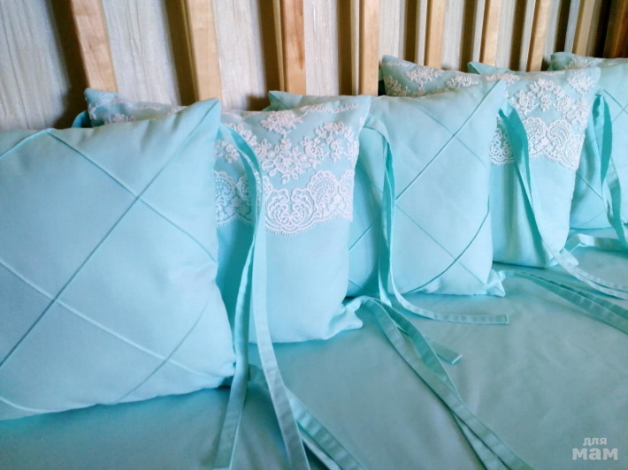 Комплект состоит из простыни на резинке на матрас 120 на 60 см, пододеяльника 140 на 110 см, наволочки 60 на 40 см и 12 бортиков-подушечек на весь периметр кроватки. Сшит из 100% польского хлопка. Возможен повтор в другом цвете и размере.