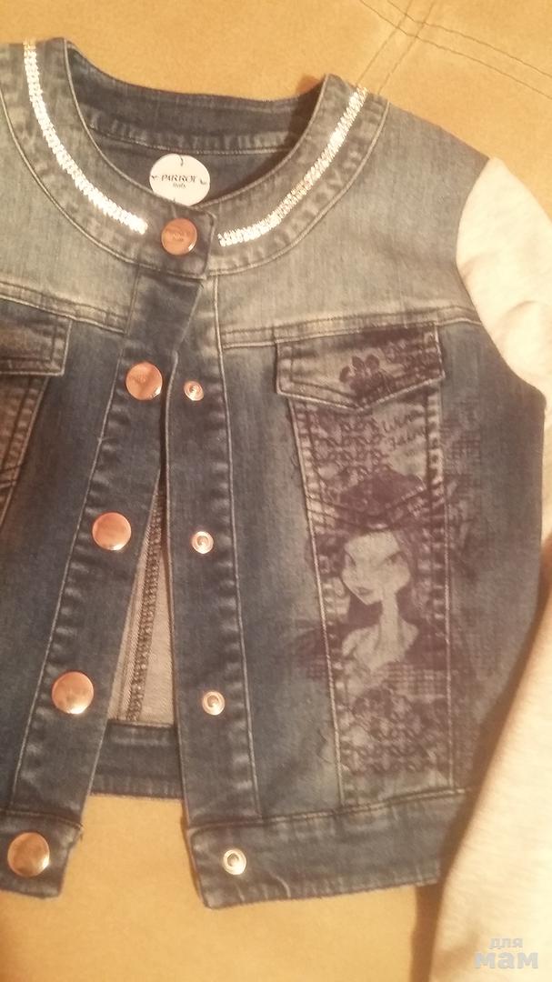 Необычный, запоминающийся комплект (джинсы и курточка). Комбинированный (рукава куртки и задняя часть штанов выполнены из серого трикотажа).В отличном состоянии, после х/ч.
