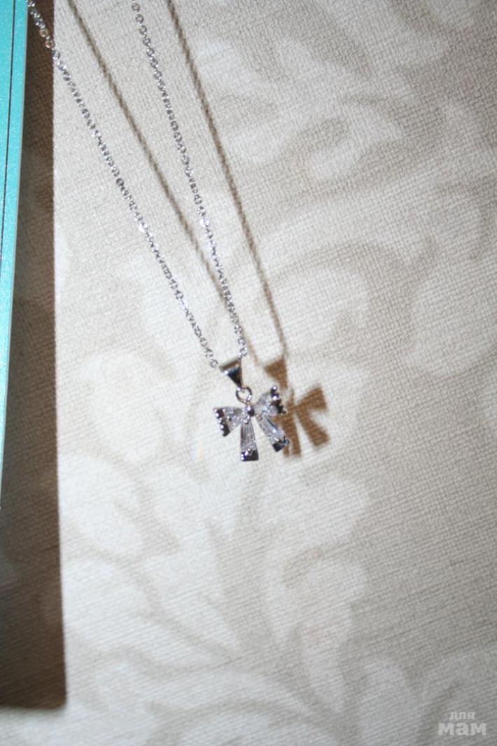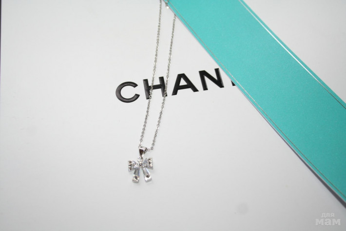 Бижутерия с родиевым покрытием. Гипоаллергенно. Не темнеет. На свету играет переливами. Камушки в бантике блестят.