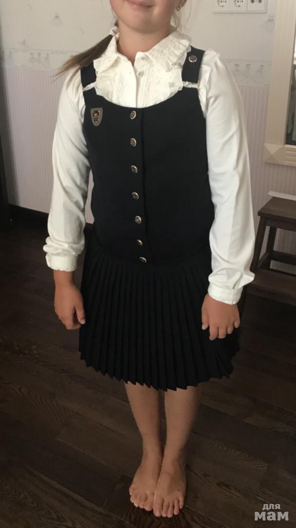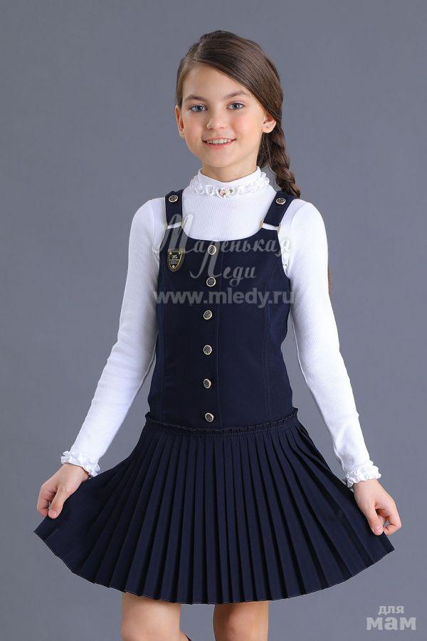 Удобный школьный сарафан для девочки. Трикотажные боковые вставки обеспечивают плотную посадку по фигуре. Юбка плиссе с заниженной линией талии. Плиссировка выполнена очень качественно, сарафан прост в уходе. Дополнительным украшением служит золотой значок с логотипом бренда. Модель застегивается спереди на фирменные пуговицы. Длина бретелей регулируется.