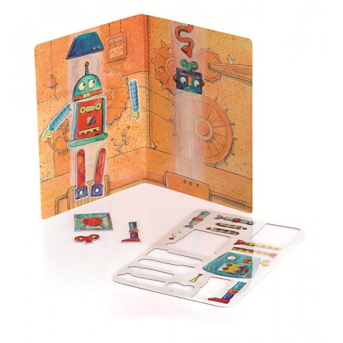 Забавная магнитная игра для мальчика. Магнитная основа в виде завода по изготовлению роботов. Ребенок с интересом будет строить роботов из всевозможных деталей, придумывая им необходимые функции и оригинальный дизайн.