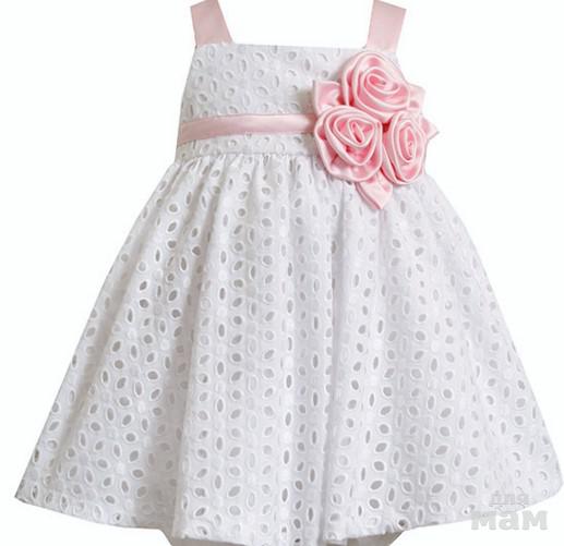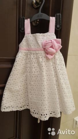 Выполнен из х/б кружева. Бретели и розочки - из шелковистой ткани с небольшим блеском. Отличный вариант для лета На ребенке смотрится очень красиво и нарядно, юбочка держит форму. Живое фото неудачное. В жизни выглядит именно как на каталожном фото. Состояние отличное. К платью могу предложить розовое х/б болеро на тон ярче цвета розочек.