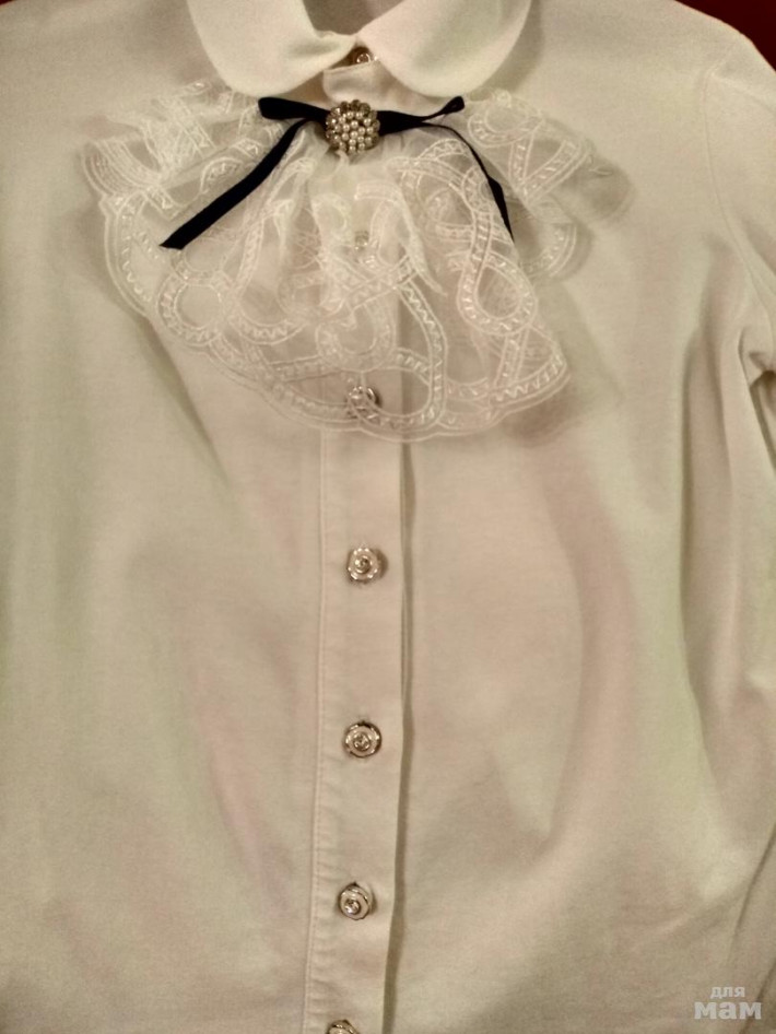 Блузочка фирмы Дували, трикотажная, кремовая, носили только на линейки. Немного стерлась краска на пуговках, заметно при ближайшем рассмотрении, у нас под сарафаном или жилетом не было видно. Жабо отстегивается, брошь съемная.Идет в размер без запаса или чуть маломерит на мой взгляд, на рост 125-135см, на стройную девочку.
