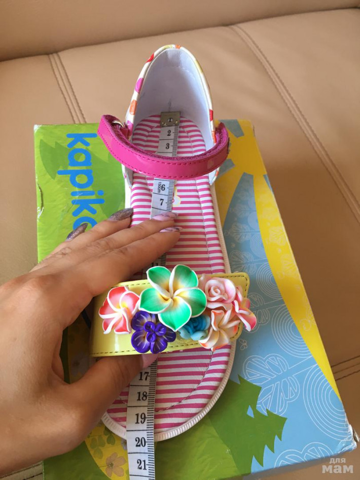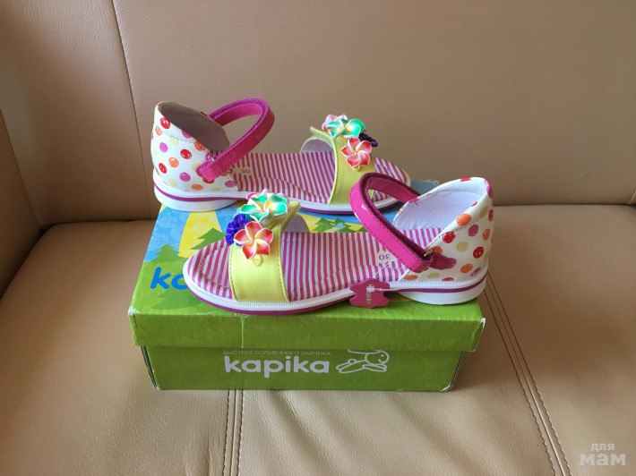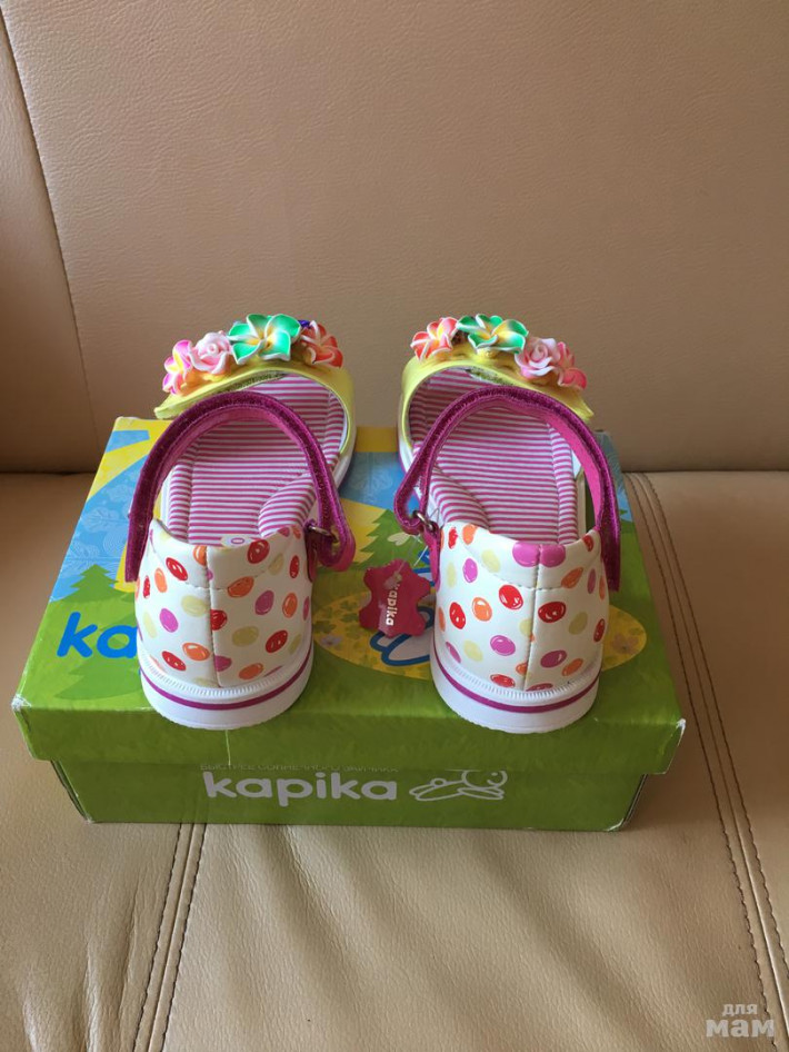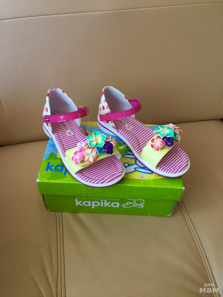 Новые красивейшие босоножки Капика (Kарikа). Пролетели с размером, указан 30, но лучше, наверное, будет на 29 р. Стелька до строчки - 18 см, до края сандалей - 19 см.