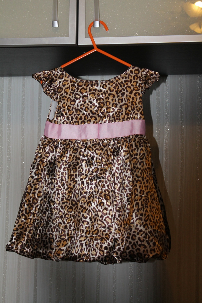 Платье на подкладе, подклад по всему платью - тоненький хлопок, верх - полиэстр. Размер указан 90, мы одевали на 2 годика, можно позже. Длина по спинке (от плечика до подола) - 48 см, юбка сделана "баллончиком", ширина между подмышками -27 см. Б\у пару раз, состояние нового.