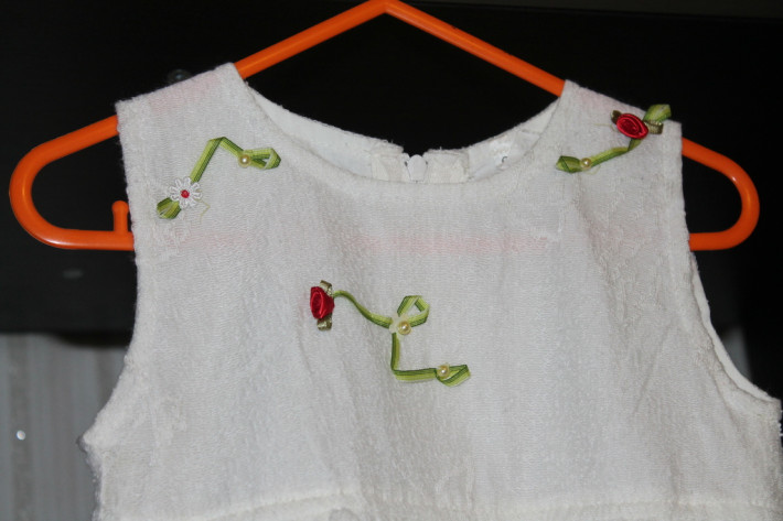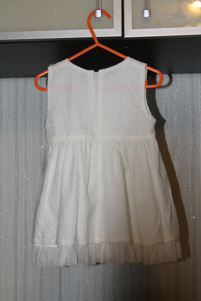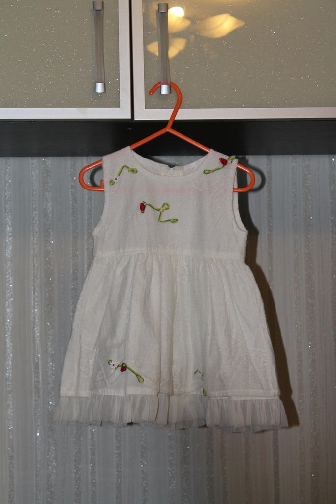 Очаровательное платье, привезено из Англии, размер указан "2", но мы одевали в годик+, платье двухслойное, полностью хлопок, подклад гладкий, верхний слой как тоненькое кружево. Смотрится очень нежно.
