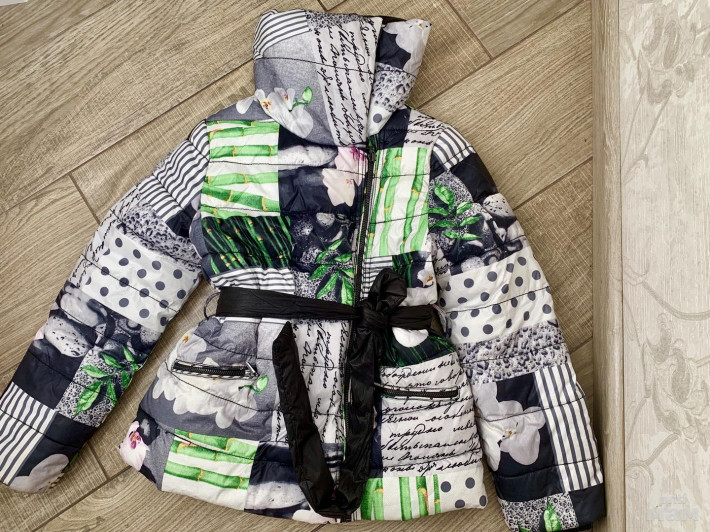 Куртка из коллекции «Бамбук» . Утепленная куртка с асимметричной застежкой-молнией из яркой орнаментальной плащевки - идеальное решение для холодной осени и зимы. Высокий "воротник -труба" надежно защитит от ветра и стужи. В распахнутом состоянии воротник послужит контрастным акцентом. Куртка имеет удобные карманы на молнии. На вороте есть нюанс( смотрите фото). Все остально в идеале .