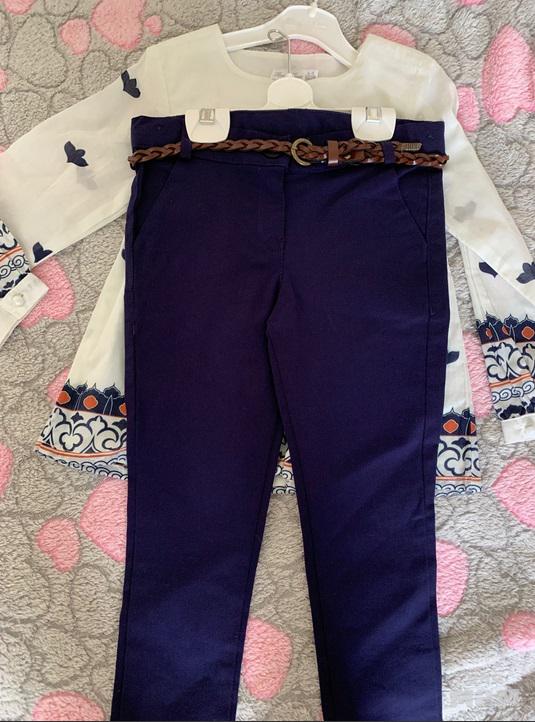 Брючный костюм из трех предметов: туника, брюки, ремень. Брючная ткань плотнее туники. Производство: Турция.