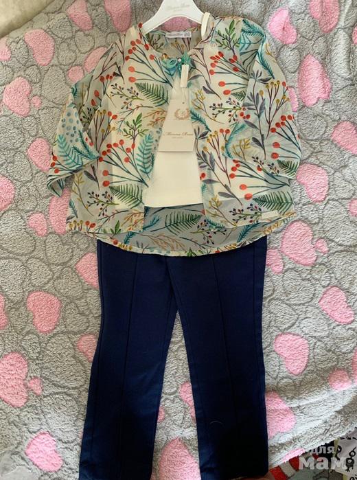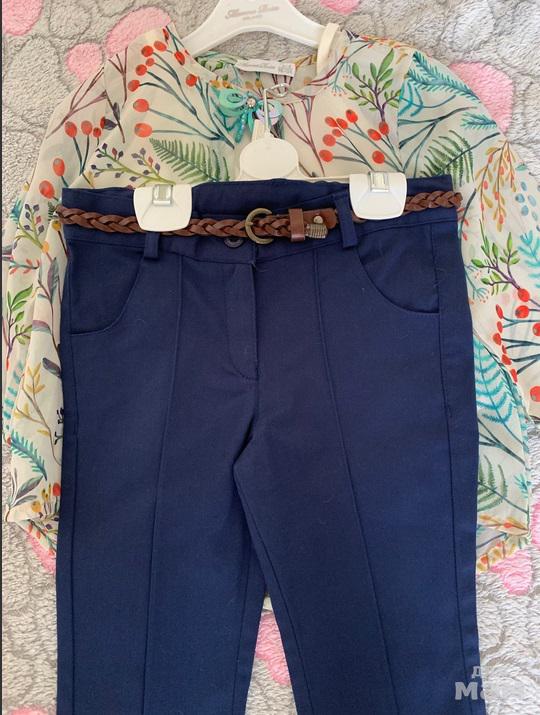 Брючный костюм из пяти предметов: туника, брюки, ремень, топ со стразами и брошь. Брючная ткань плотнее туники. Производство: Турция.Ткань 100% хлопок. Качество отличное.