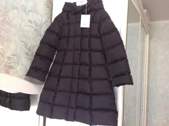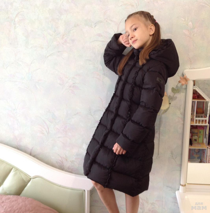 Новая коллекция 19/20! Размер 8, цвет чёрный . Очень плотно пухом набито . Подмышки -38, рукав-51,5/38,5, длина по центру спинки -74,5. На фото рост 131.