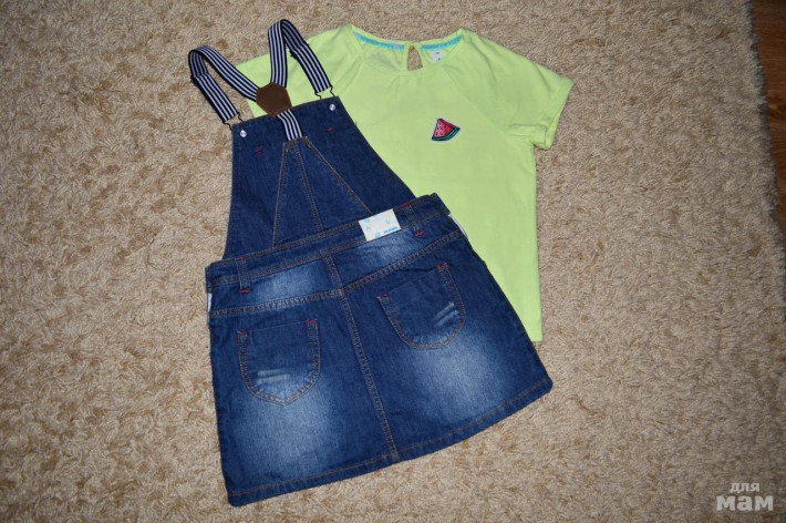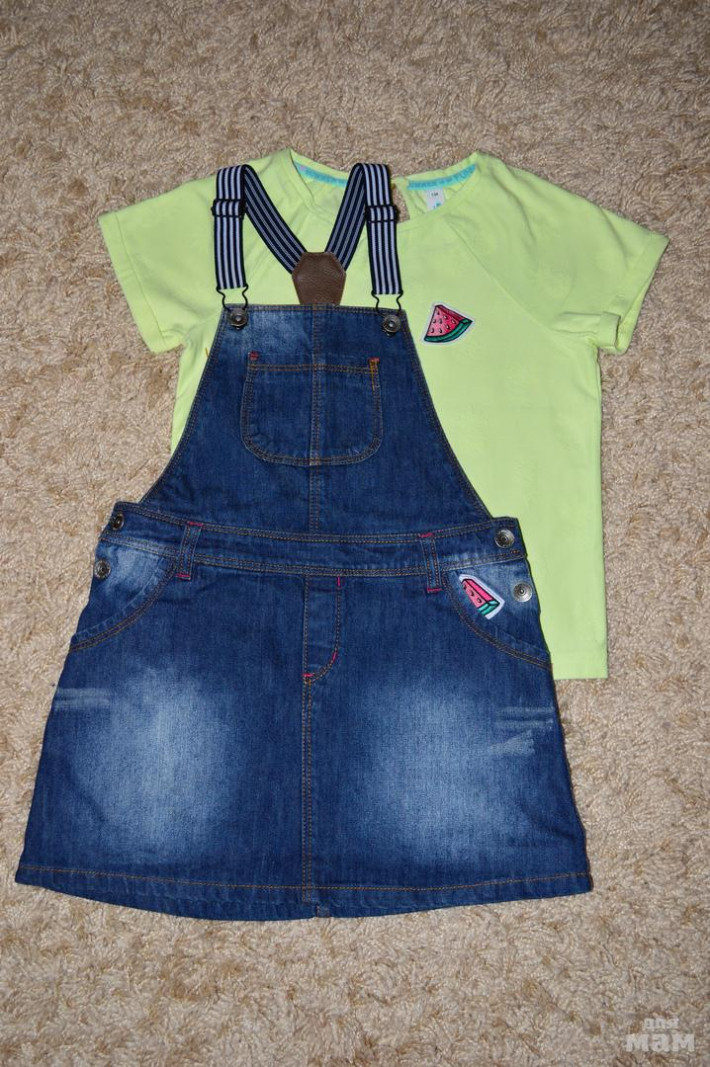 Комплект в отличном состоянии. Размер 134 у сарафана и у футболки. Бретели регулируются, на поясе кнопки. Сарафан 750р. футболка 350р. продажа только комплектом.