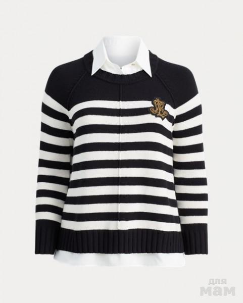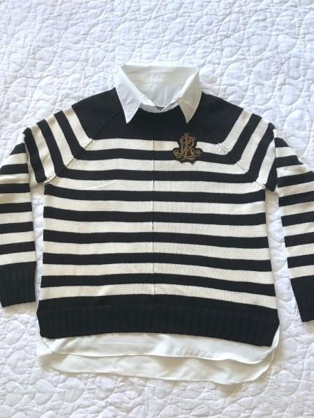 Свитер с рубашкой обманкой. Состав: 60% хлопок, 40% акрил. Воротник и подол: 100% полиэстер. Вышитый золотыми нитками логотип на груди. Покупала на офсайте, стоил 120$