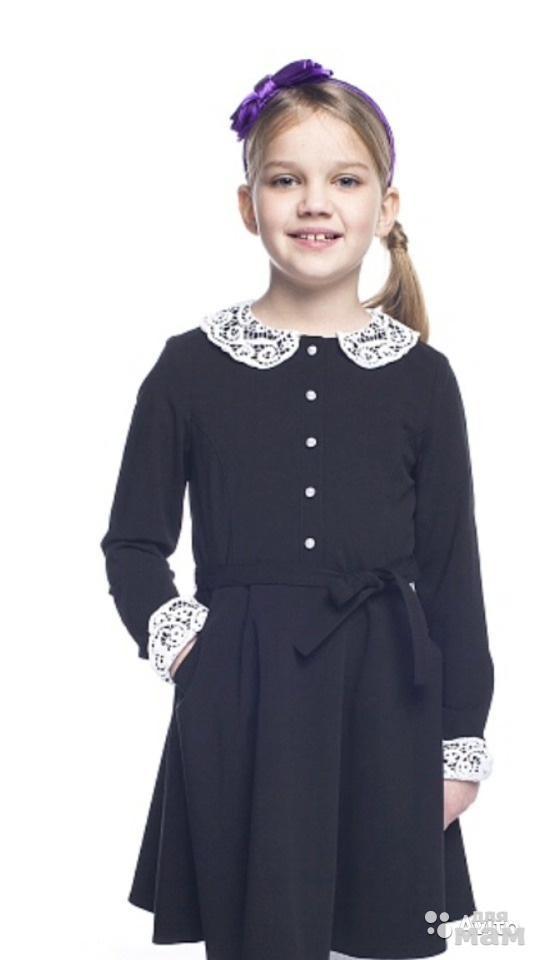 Школьное платье для девочки с заниженной линией талии. Юбка декорирована встречными складками. Нарядным это платье делают кружевной воротники и манжеты, которые легко снимать для стирки. Размер 128. одето пару раз, в состоянии нового.