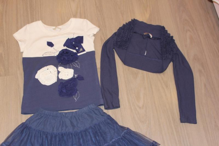 Комплект Моннализа б/у в хорошем состоянии р.6 пышная синяя юбка, футболка с украшениями и болеро из этой коллекции, 3500 р. ПРОДАНО