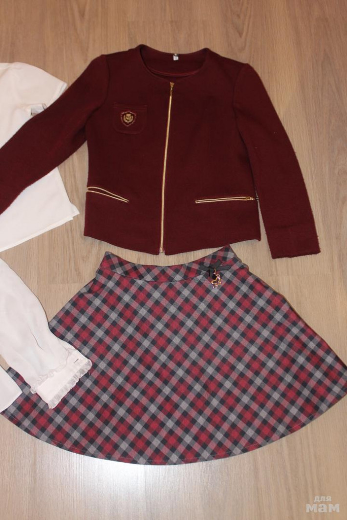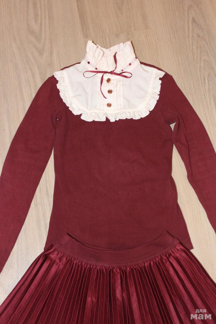 Комплект школьной формы на 7-8 лет: пиджак бордо Маленькая леди б/у, блузка Маленькая леди с длинным рукавом б/у, блузка с бантом на плече (очень эффектно смотрится), блузка с воротничком в стразах, юбка атласная плиссе Маленькая леди с очень красивой кофточкой бордо с белым жабо, комплект 2000 р. все.