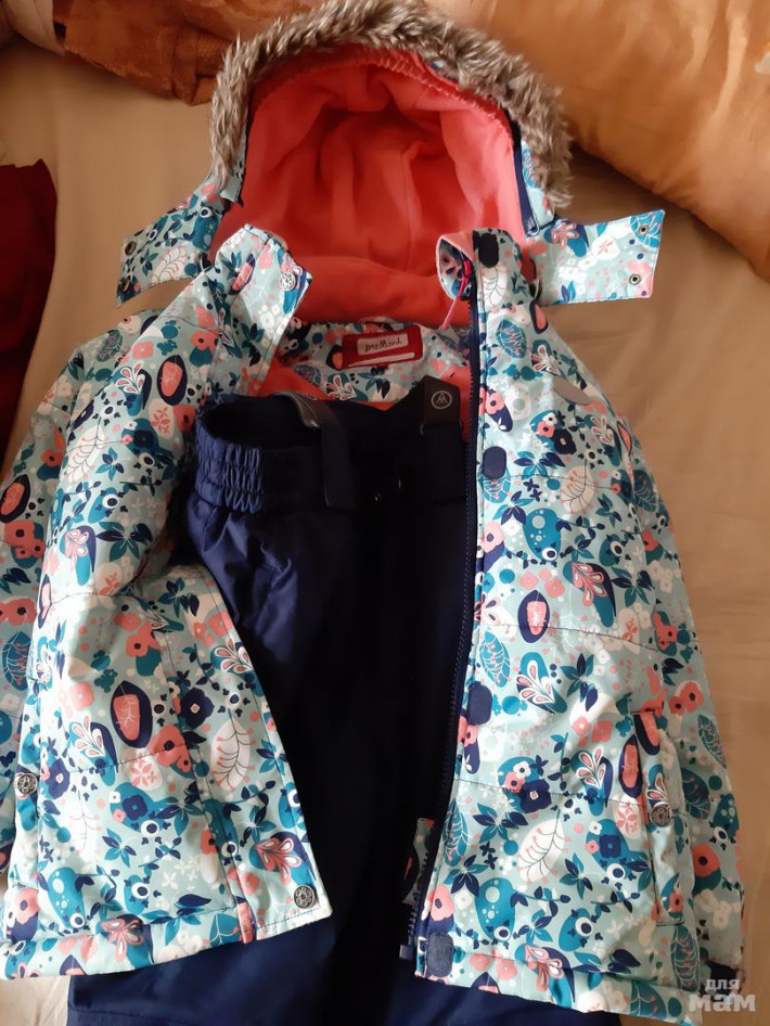 Комплект очень тёплый,б/у мало,усилены колени/попа/низ штанины,брючины подворачиваются. Состояние отличное,кроме колен-чуть подзатерты-видимо ползала где-то или с горок съезжала🙈 брюки на лямках(можно отстегнуть). Мех искусственный. Производитель Канада