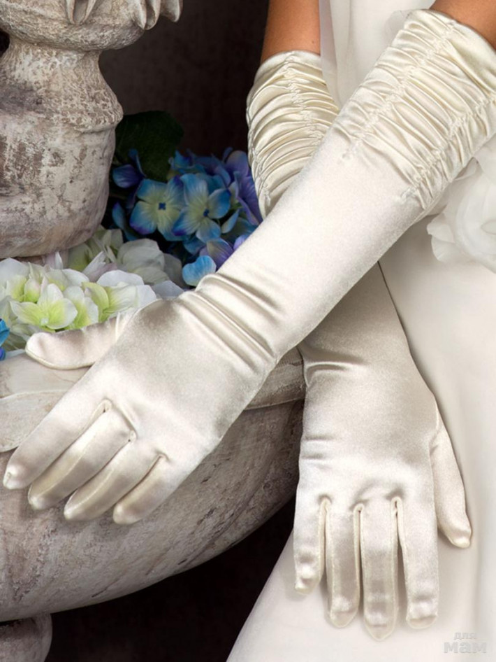 Удлинённые атласные перчатки с оригинальной драпировкой по верхней части раструба.