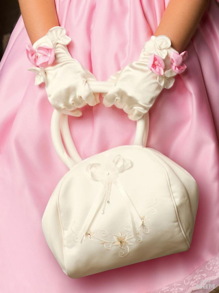 Лаконичная модель необычной формы. С обеих сторон сумочка оформлена изысканной вышивкой и стразами. Центральная деталь – цветок с атласными лентами и жемчужной нитью. Ручки сумки, обтянутые тканью, прекрасно держат форму.